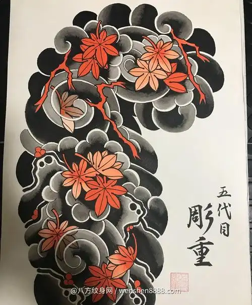 原创浪花花臂枫叶日式传统纹身手稿_纹身_花臂_青岛奥帆中心攻略_刺青