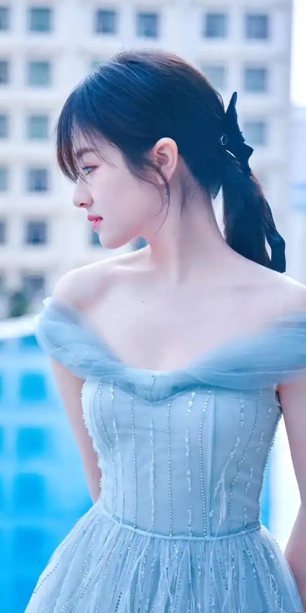 李兰迪蓝色一字肩流苏长裙造型壁纸写真#李兰迪